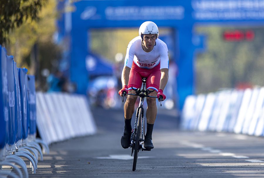 Anton Vorobyev of Russia competes during the men's individual time trial final of the cycling road at the 7th International Military Sports Council (CISM) Military World Games in Wuhan, capital of central China's Hubei Province, Oct. 19, 2019. (Xinhua/Xiong Qi)