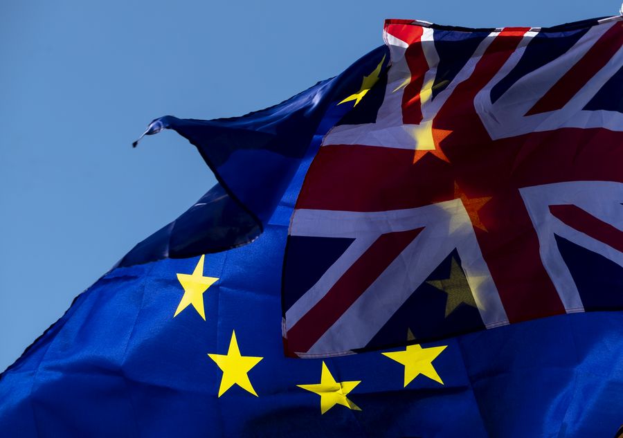 Photo taken on Oct. 19, 2019 shows the European Union flag and the Union Jack flag outside the Houses of Parliament in London, Britain.(Xinhua/Han Yan)
