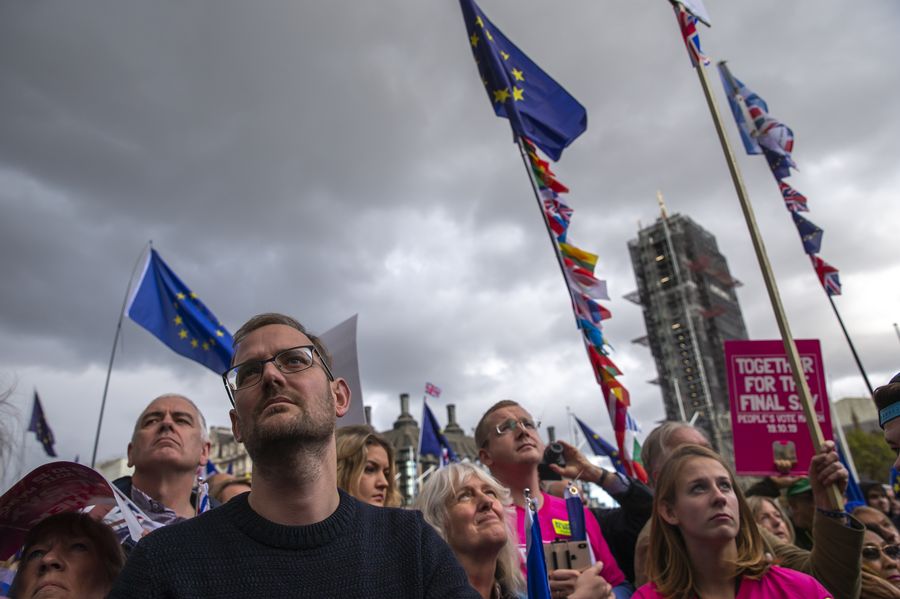 People react to the latest result of the amendment during the "Together for the Final Say" event at the Parliament Square outside the Houses of Parliament in London, Britain, Oct. 19, 2019.(Xinhua/Han Yan)
