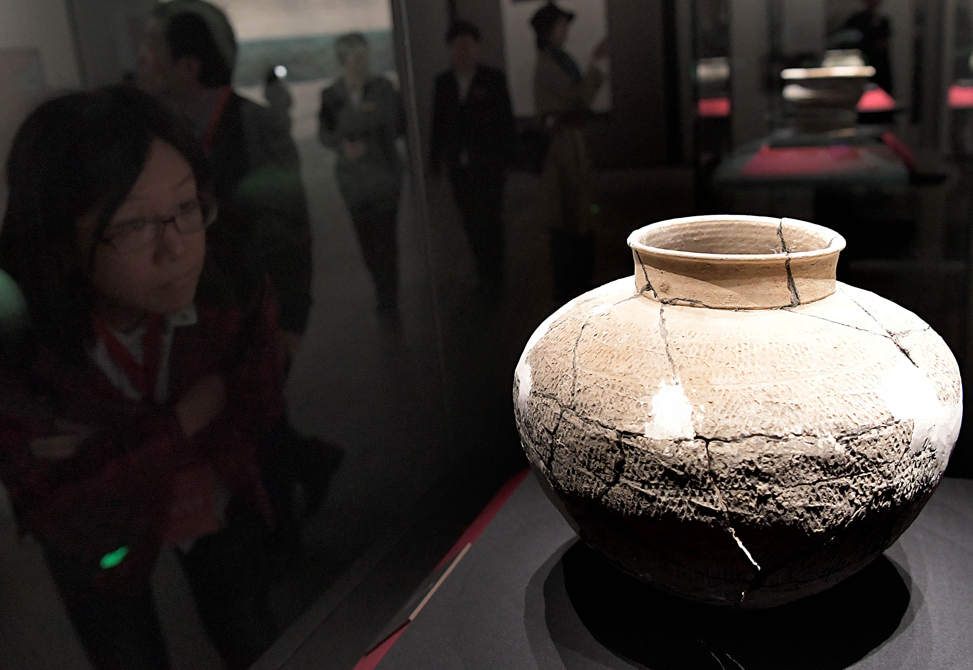 A visitor views pottery ware exhibits at the Erlitou Relic Museum in Luoyang, central China's Henan Province, Oct. 19, 2019. (Xinhua/Li An)