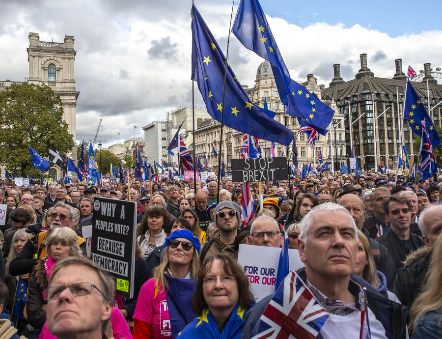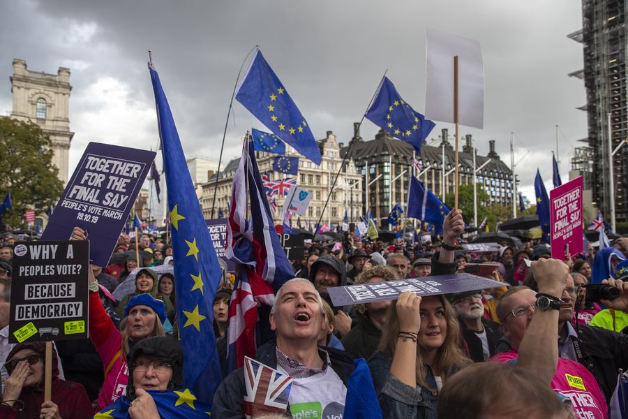 People take part in the "Together for the Final Say" event at the Parliament Square in London, Britain, on Oct. 19, 2019. (Xinhua/Han Yan)