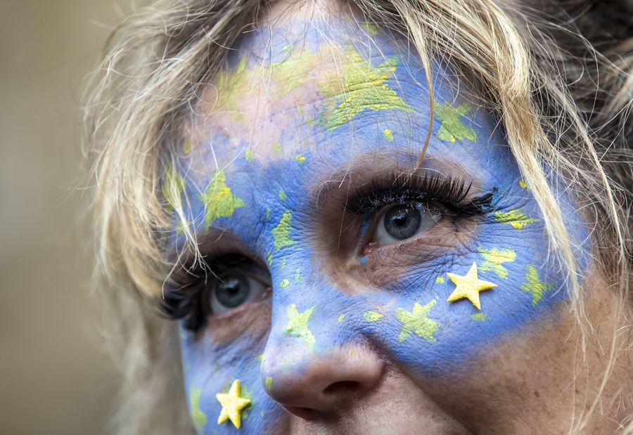 A woman with her face painted in the colors of an EU flag takes part in the "Together for the Final Say" event at the Parliament Square in London, Britain, on Oct. 19, 2019. (Xinhua/Han Yan)