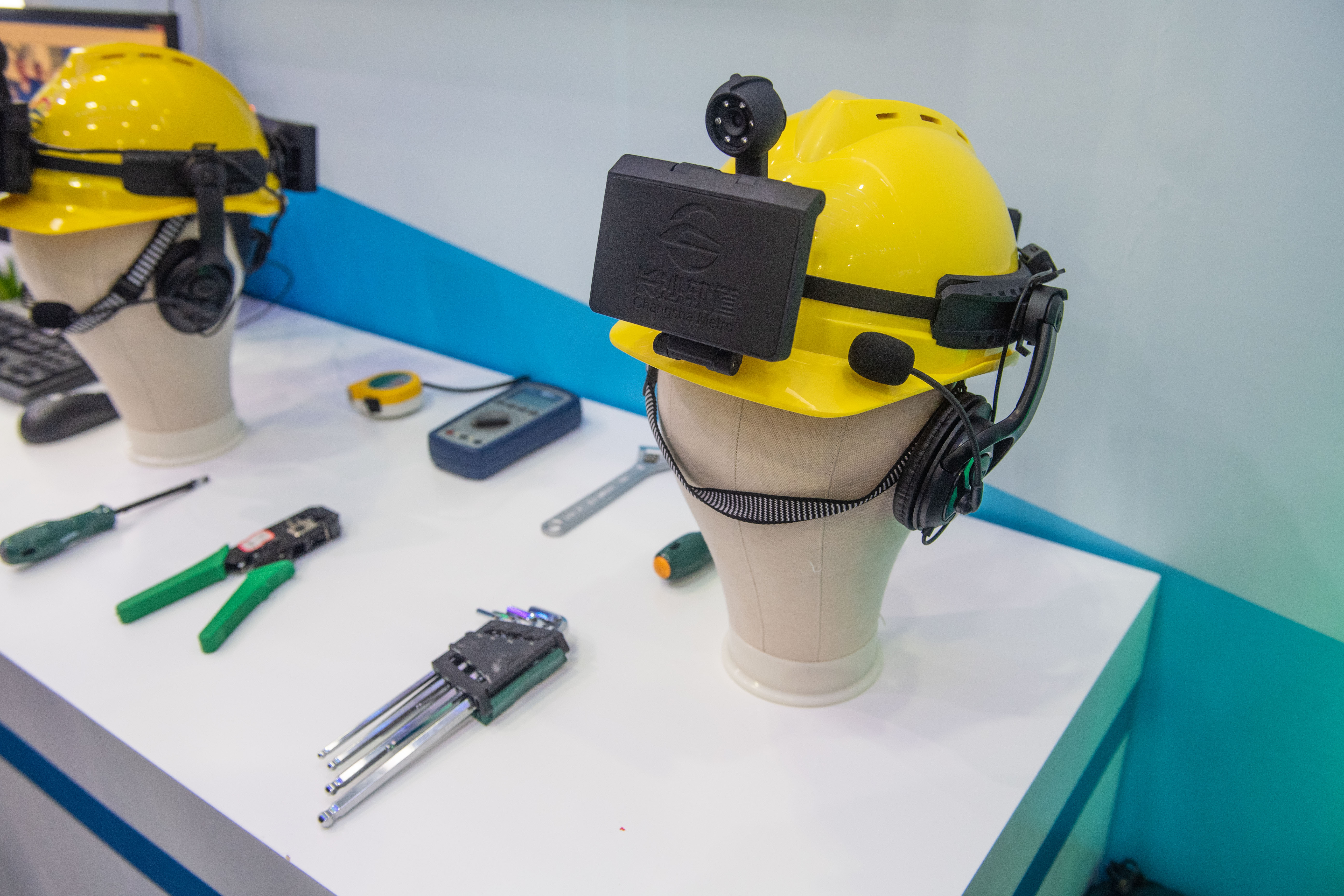 At the exhibition, an intelligent maintenance helmet independently developed by Changsha Metro Group made its debut.