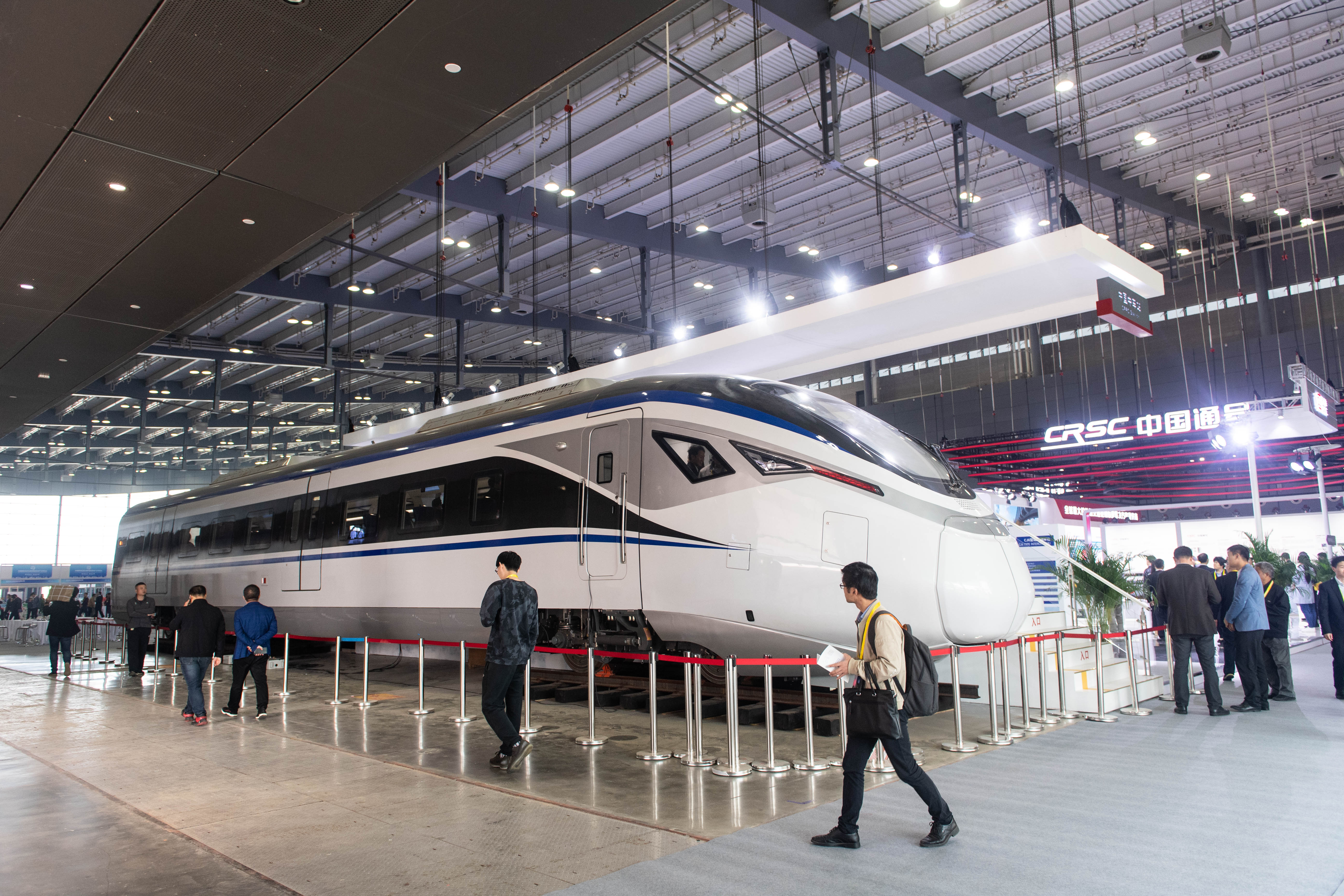 The CJ6 intercity EMU train manufactured by CRRC Zhuzhou Locomotive Co., Ltd. is exhibited at the 2019 China International Rail Transit and Equipment Manufacturing Industry Expo in Changsha, central China's Hunan Province, Oct. 18, 2019. (Xinhua/Chen Sihan)