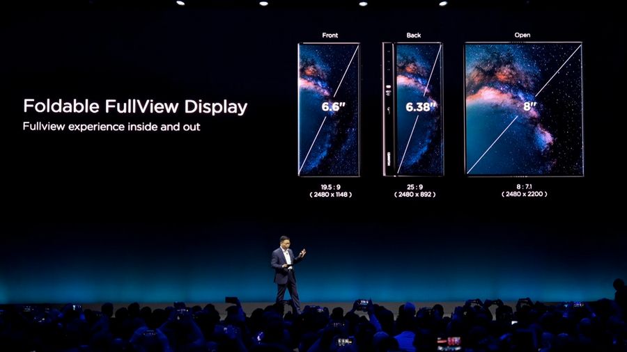 Richard Yu presents the Mate X, a foldable 5G ready smartphone, ahead of the Mobile World Congress in Barcelona, Spain on Feb. 24, 2019. The Mate X has a 6.6-inch screen, which can be opened out into an eight-inch OLED screen to allow the user to read or view videos. (Xinhua)