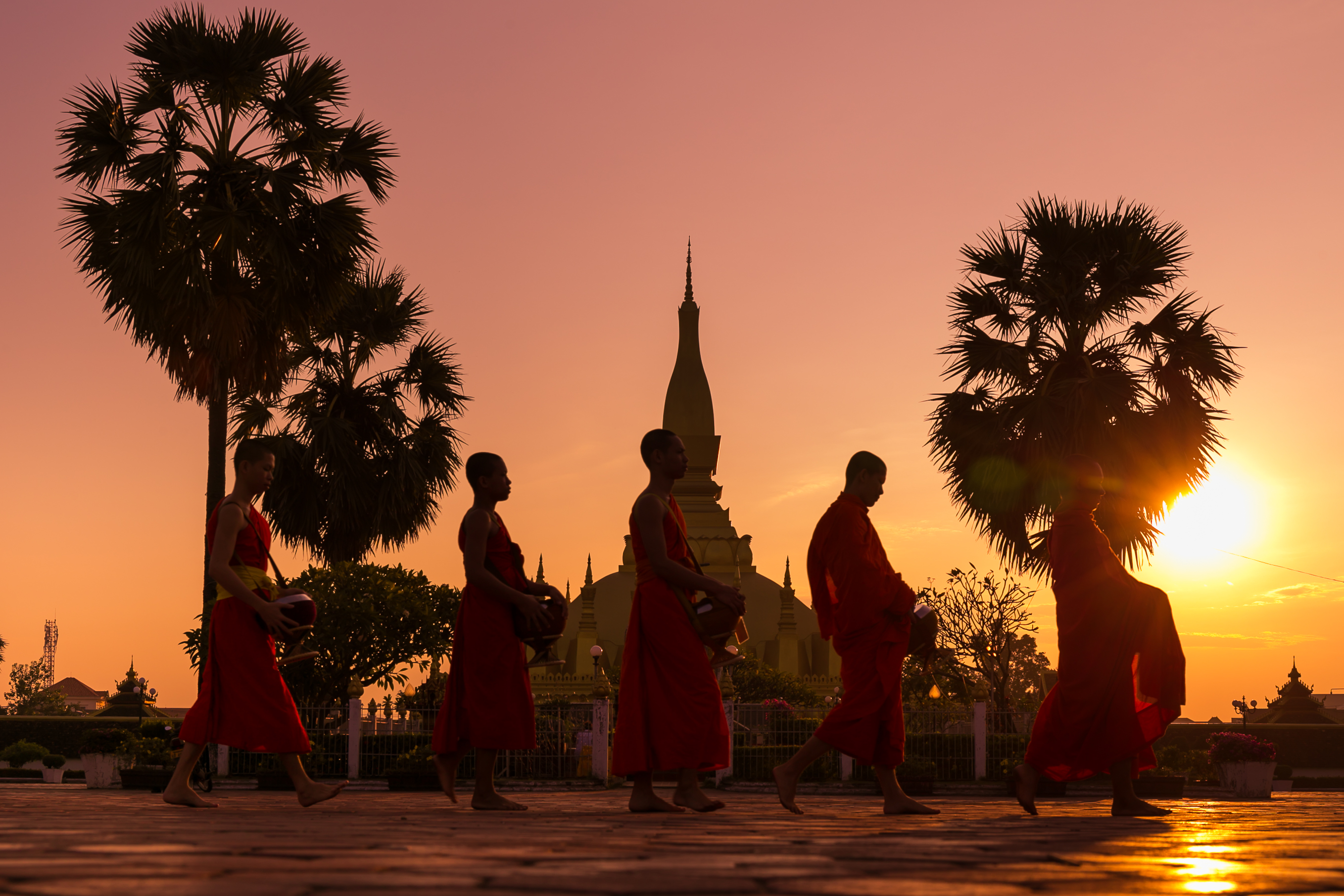 A group of monks pass by That Luang Stupa in Vientiane, Laos, Oct. 26, 2019. (Photo by Kaikeo Saiyasane/Xinhua)