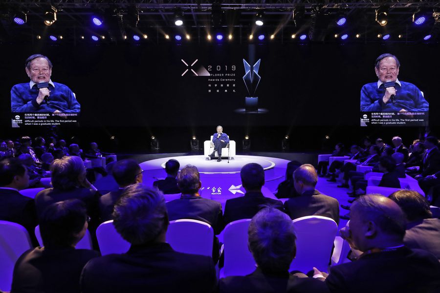 Yang Chen-ning, a Nobel prize-winning physicist and also an initiator of the Xplorer Prize, speaks during the 2019 Xplorer Prize award ceremony in Beijing, capital of China, Nov. 2, 2019. The 2019 Xplorer Prizeawards ceremony kicked off here on Saturday. The Xplorer Prize was jointly initiated by Tencent Chairman and CEO Pony Ma and 14 scientists in 2018 to support full-time Chinese mainland-based scientists under age of 45 in areas of fundamental science and cutting-edge technologies.