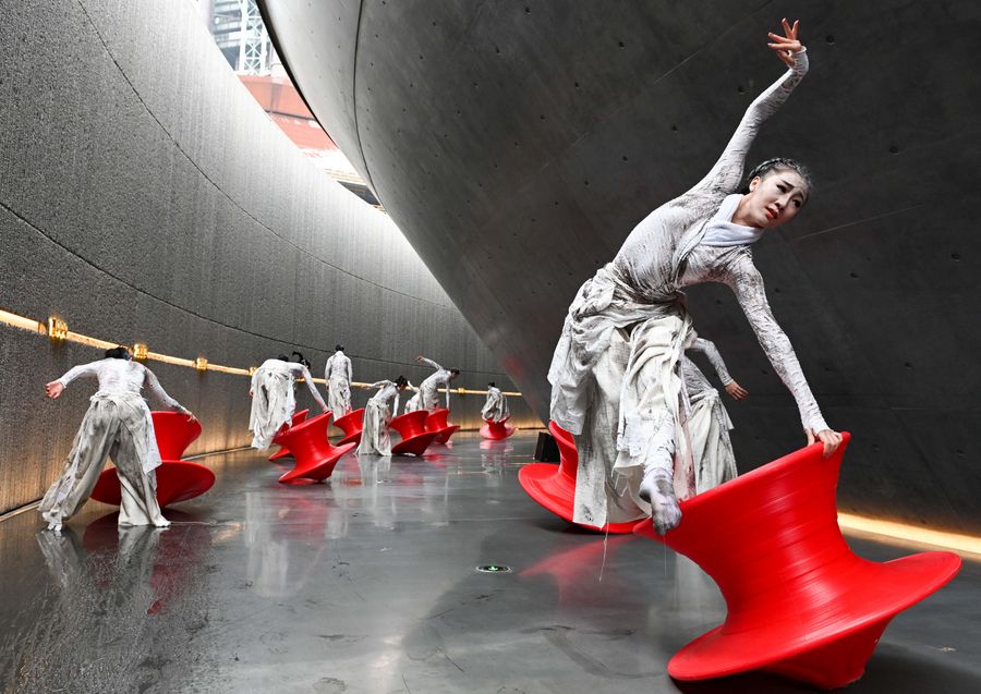 Dancers perform during a dance show at the Shougang Park in Beijing, capital of China, Nov. 2, 2019. A two-day dance show is held at the Shougang Park, a former steel plant, in Beijing. (Xinhua/Chen Yehua)