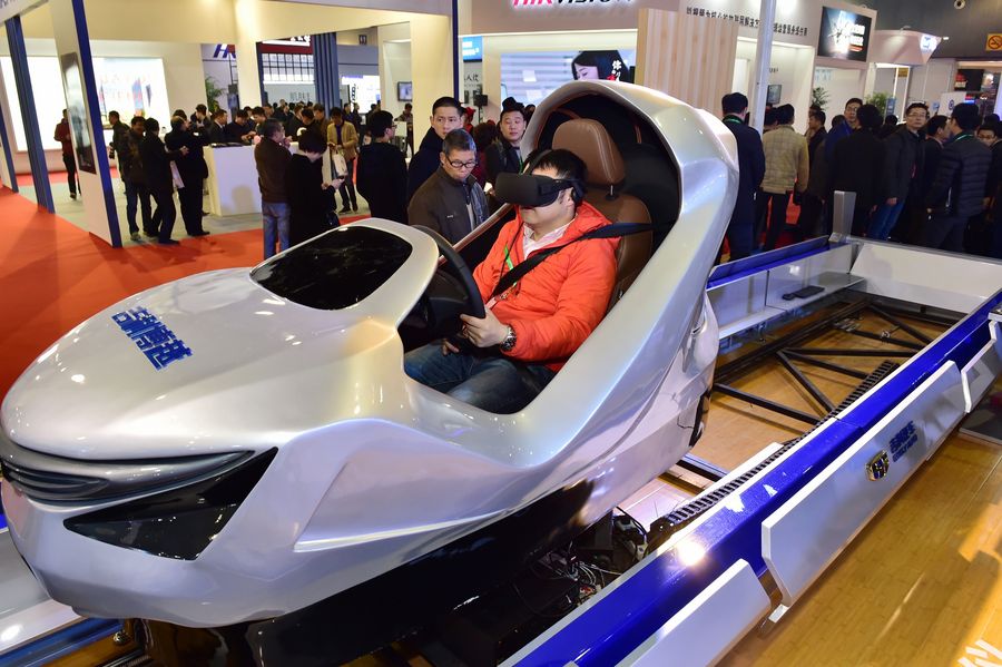 A visitor experiences on a vehicle equipped with intelligent security system during an expo in east China's Zhejiang Province. (File Photo)