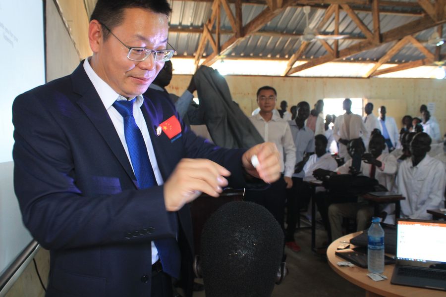 Tang Youbin (L), Traditional Chinese Medicine expert, demonstrates how to conduct acupuncture during a lecture for medical students at Upper Nile University in Juba, South Sudan, Aug. 2, 2019. (Xinhua/Gale Julius)