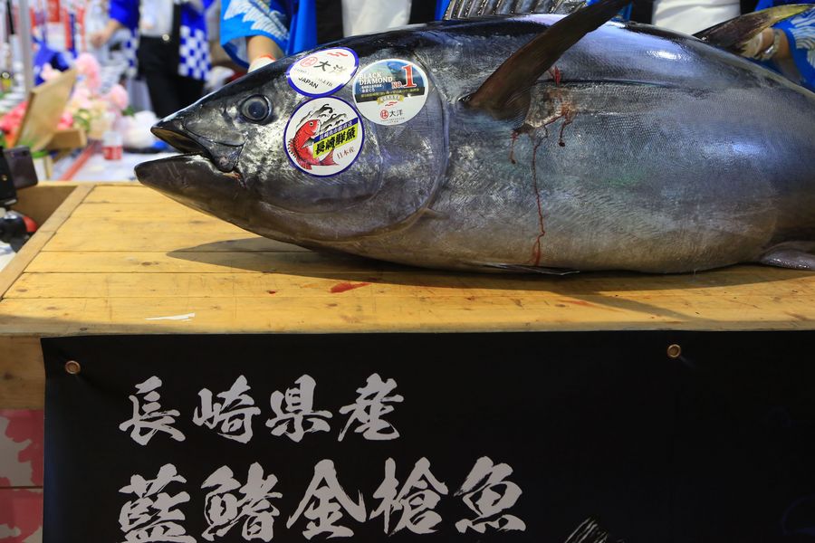A 70 kg bluefin tuna is to be disintegrated at the Food and Agricultural Products exhibition area during the second China International Import Expo (CIIE) in Shanghai, east China. (Xinhua/Sui Xiankai)