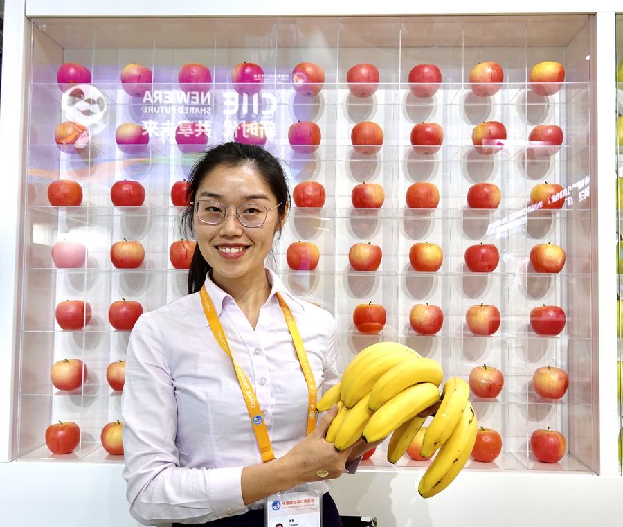 A staff member shows bananas at the Food and Agricultural Products exhibition area during the second China International Import Expo (CIIE) in Shanghai, east China. (Xinhua/Cai Yang)