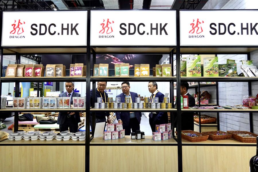 People visit the booth of a Hong Kong company at the Food and Agricultural Products exhibition area during the second China International Import Expo (CIIE) in Shanghai, east China. (Xinhua/Cai Yang)