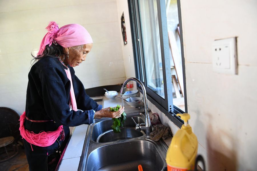 Pan Lianzhen of Yao ethnic group washes vegetable at home in Hebian village group, Nov. 16, 2019. (Xinhua/Yang Zongyou)