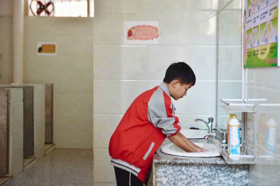 A student washes his hands in the washroom at Heping Primary School in Heping Township, Sanjiang Dong Autonomous County in south China's Guangxi Zhuang Autonomous Region, Oct. 30, 2019. (Xinhua/Cui Bowen)