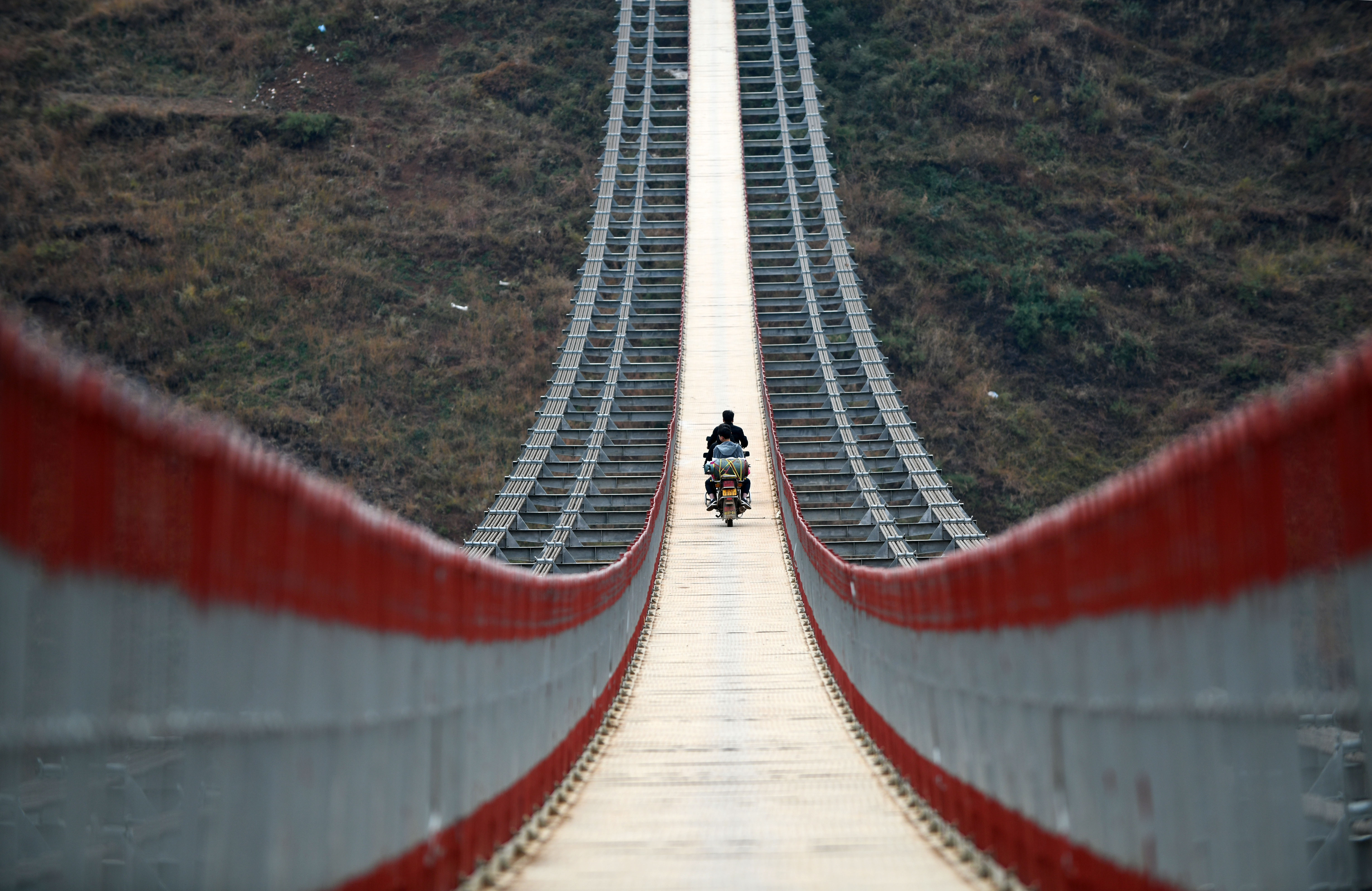 A man rides a motorbike on a bridge spanning the Niulan River in southwest China on Dec. 11, 2019. (Xinhua/Yang Wenbin)