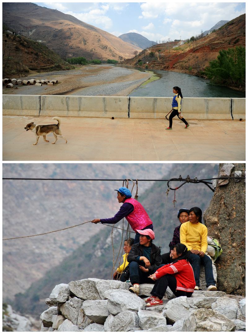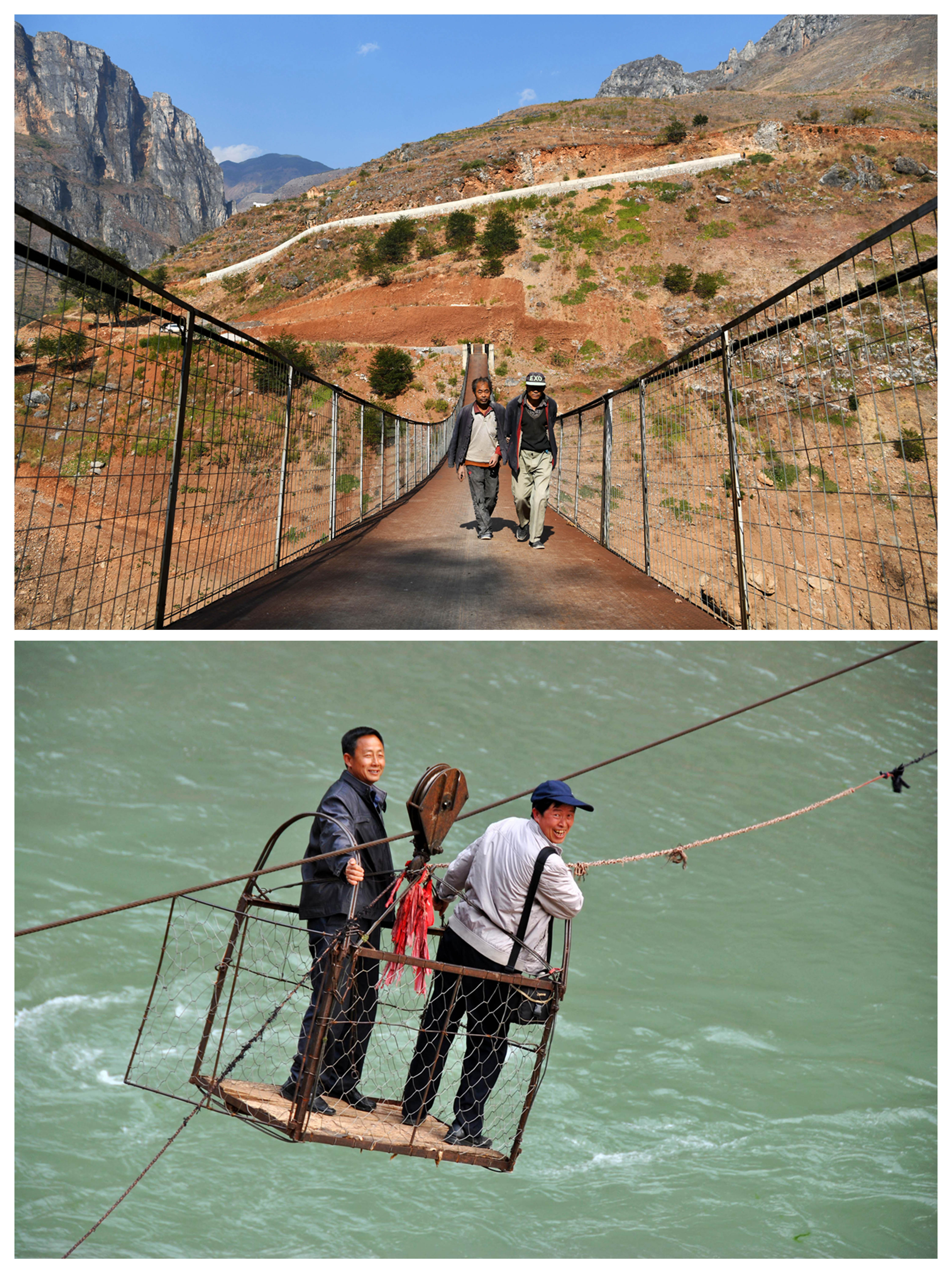 Combo photo shows a villager walking on a bridge (upper) linking Weining County in southwest China's Guizhou Province and Huize County in southwest China's Yunnan Province on March 13, 2018 and people of Huize using cableway (lower) on March 7, 2013. (Xinhua/Yang Wenbin)