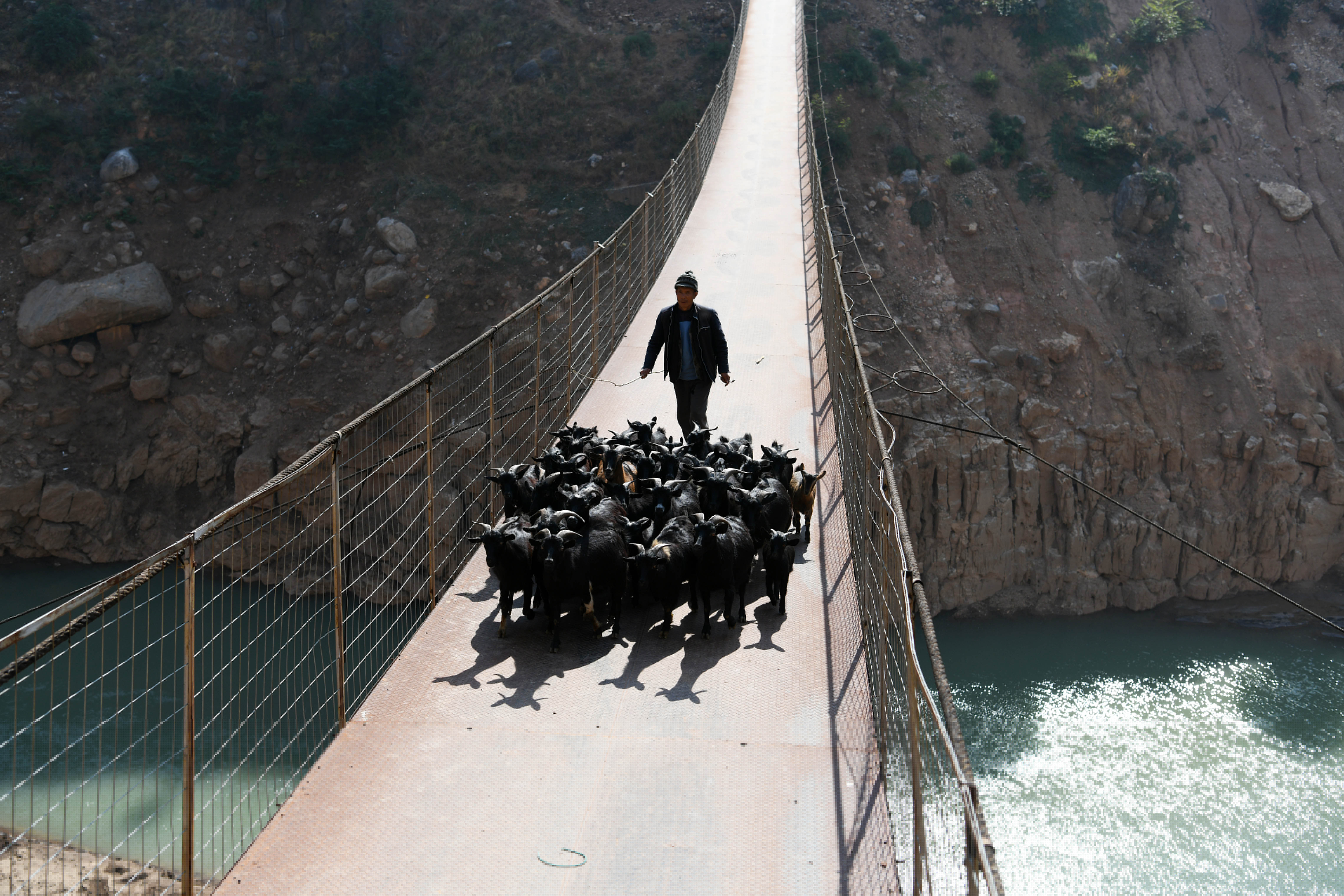 A man herds the sheep on a bridge spanning the Niulan River in southwest China on Dec. 12, 2019. (Xinhua/Yang Wenbin)