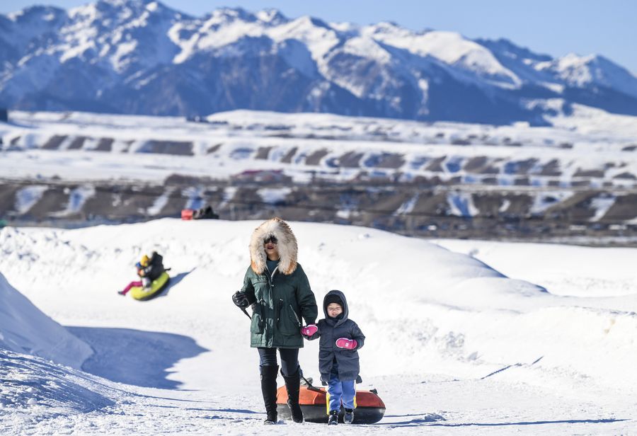Tourists play at a ski resort in Urumqi, northwest China's Xinjiang Uygur Autonomous Region, Dec. 8, 2019. (Xinhua/Wang Fei)