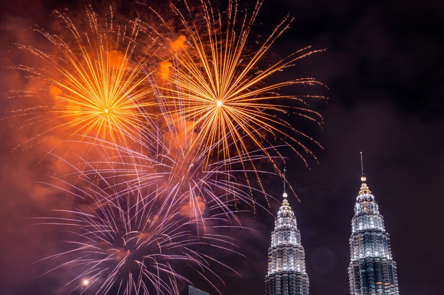 Photo taken on Dec. 31, 2019, shows people celebrate the New Year near the Petronas Twin Towers in Kuala Lumpur, Malaysia. (Xinhua/Chong Voon Chung) ■