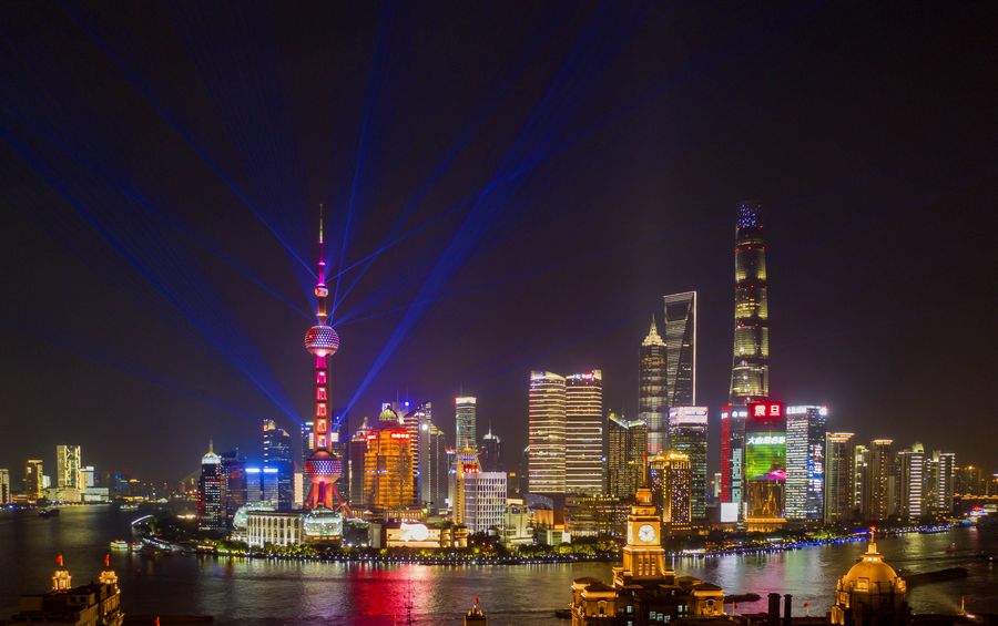 Aerial photo taken on Sept. 26, 2019 shows a night view at Lujiazui area in Pudong District of east China's Shanghai. (Xinhua/Ren Long)