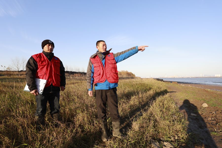 File photo taken on Dec. 28, 2018 shows former fisherman Yang Jinlong (L), a patrolman in an all-volunteer monitoring team consisting of dozens of fish farmers, monitoring the protection of Yangtze finless porpoises with a volunteer by the Yangtze River in Nanjing, capital of east China's Jiangsu Province. (Nanjing Yangtze Finless Porpoise Conservation Association/Handout via Xinhua)