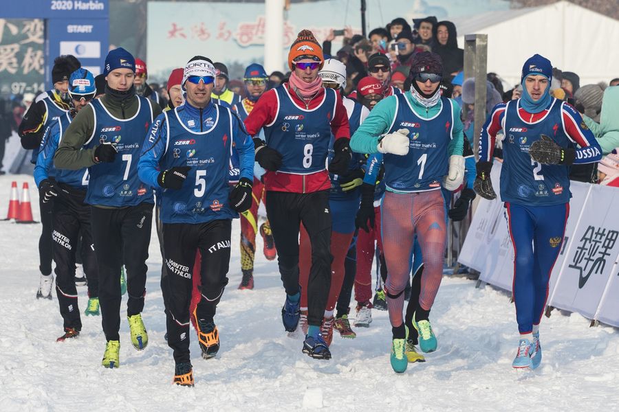 Athletes compete during the elite men group of the 2020 Harbin ITU Winter Triathlon World Cup in Harbin, capital of northeast China's Heilongjiang Province, Jan. 4, 2020. (Xinhua/Zhang Tao)
