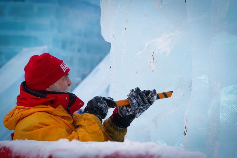 A sculptor takes part in the 9th China Harbin International Ice-Assemblage Championship in Harbin, northeast China's Heilongjiang Province, Jan. 3, 2020. (Xinhua/Zhang Tao)