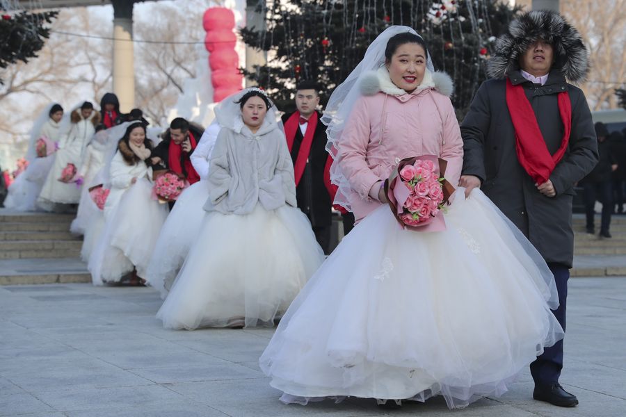 Couples attend a group wedding ceremony in Harbin, capital of northeast China's Heilongjiang Province, Jan. 5, 2020. (Xinhua/Zhang Tao)