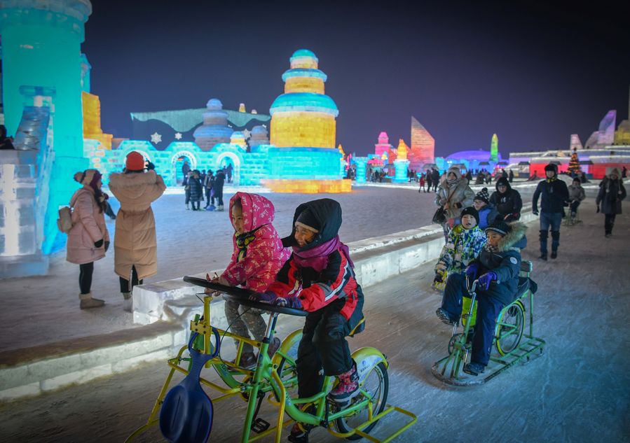 Children have fun at the 36th Harbin Ice and Snow Festival at Harbin Ice-Snow World in Harbin, capital of China's northernmost Heilongjiang Province, Jan. 5, 2020. (Xinhua/Wang Song)