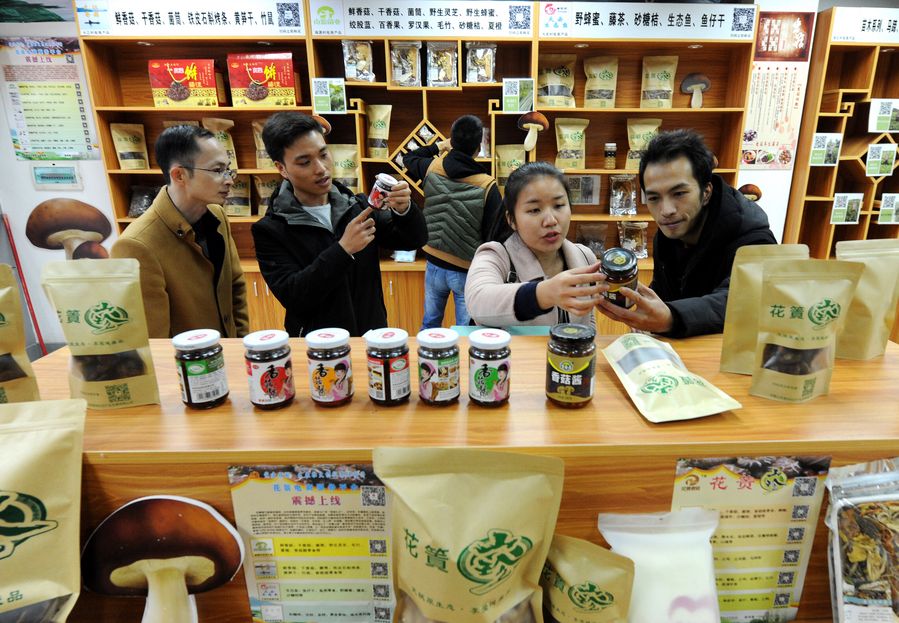 Customers select mushroom products at an e-commerce selling platform in Nanyuan Village, south China's Guangxi Zhuang Autonomous Region, Nov. 27, 2019. (Xinhua/Feng Weimin)