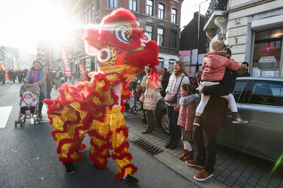 A lion dance performer interacts with the audience during a Chinese Spring Festival parade in downtown Liege, Belgium, Jan. 18, 2020. (Xinhua/Zheng Huansong)