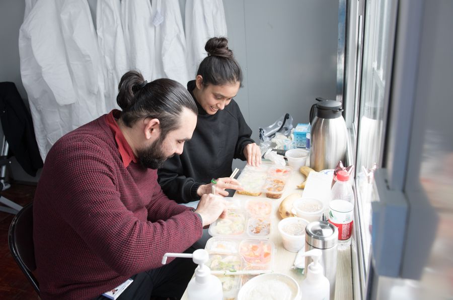 Pakistani Abdul Zahir Hamad (L) and his wife Mauritian Hosany Sumayyah have lunch at a novel coronavirus prevention-and-control checkpoint of an expressway exit in Wenzhou, east China's Zhejiang Province, Feb. 8, 2020.(Xinhua/Weng Xinyang)