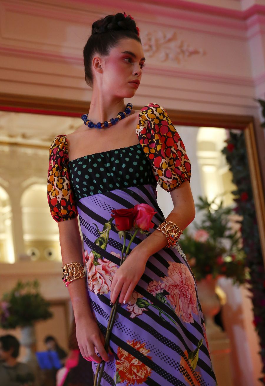 A model is seen on stage during the RIXO presentation at the London Fashion Week at Kimpton Fitzroy London Hotel in London, Britain. (Xinhua/Han Yan)