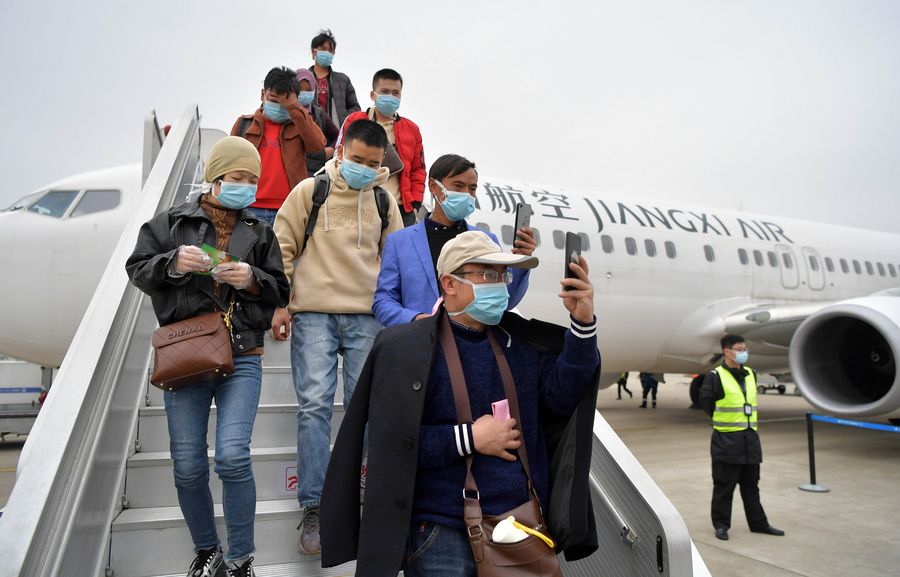 Migrant workers arrive at Nanchang Changbei Airport by a chartered flight in Nanchang, east China's Jiangxi Province, Feb. 26, 2020. First batch of some 350 migrant workers from Gansu and Qinghai provinces to Nanchang arrived by two chartered flights. (Xinhua/Peng Zhaozhi)