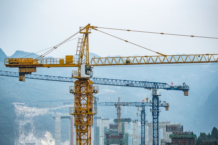 Workers work at the construction site of Tuanjie Grand Bridge of Renhuai-Zunyi Highway in southwest China's Guizhou Province, Feb. 27, 2020. (Xinhua/Tao Liang)