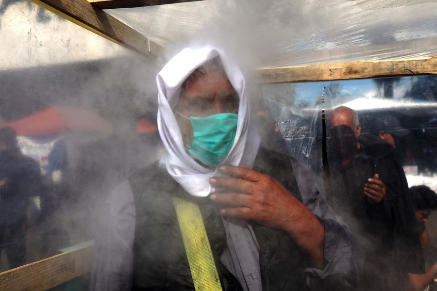 An Iraqi man is seen inside a sterilization room at Tahrir Square in Baghdad, Iraq, on March 2, 2020. (Xinhua/Khalil Dawood)