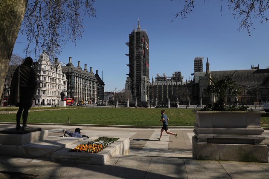 A man runs in Parliament Square in London, Britain, March 25, 2020. (Photo by Tim Ireland/Xinhua)