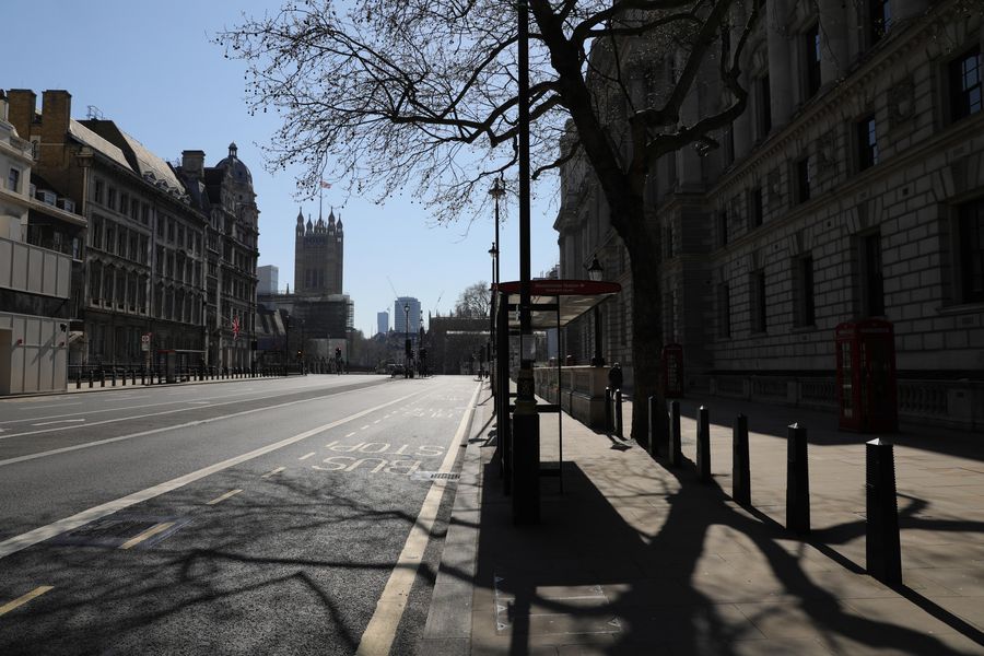 An empty Whitehall in London, Britain, March 25, 2020. (Photo by Tim Ireland/Xinhua)