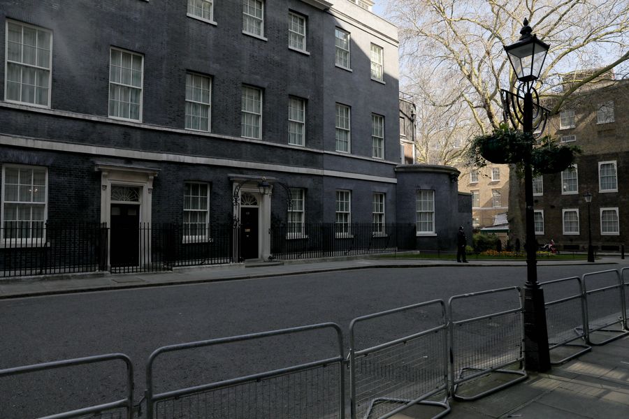 An empty Downing Street in London, Britain, March 25, 2020. (Photo by Tim Ireland/Xinhua)