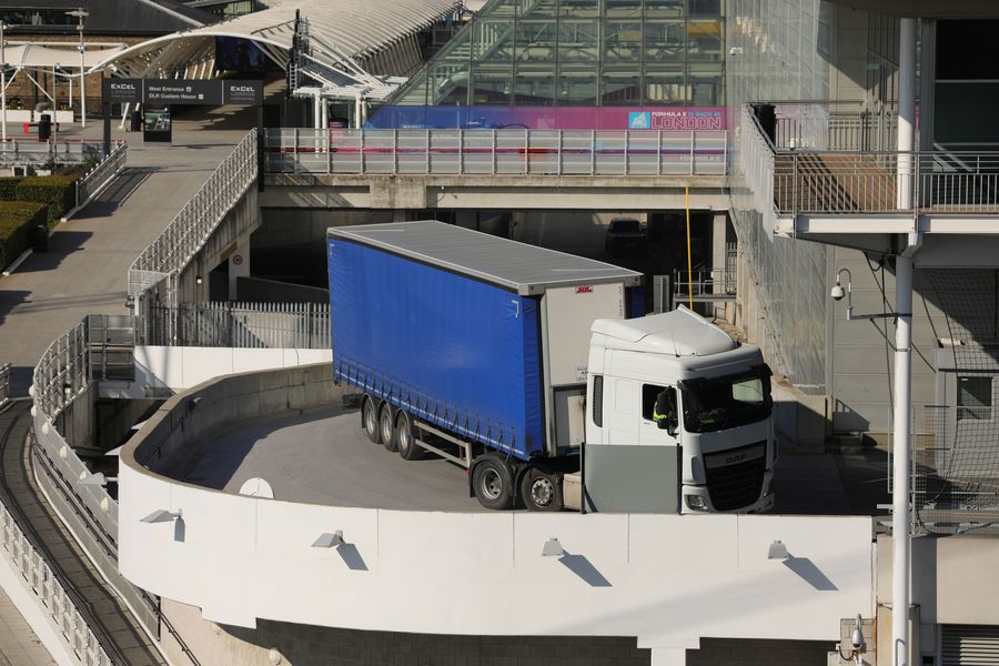 A lorry is seen outside the ExCel exhibition centre in London, Britain, March 25, 2020. (Photo by Tim Ireland/Xinhua)