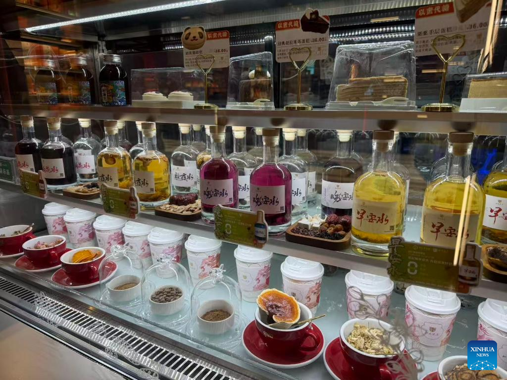 A variety of drinks infused with herbal ingredients are available at a Tong Ren Tang's coffee shop Zhima Health in Chengdu, southwest China's Sichuan Province, Dec. 15, 2025. (Photo by Wu Xiao/Xinhua)