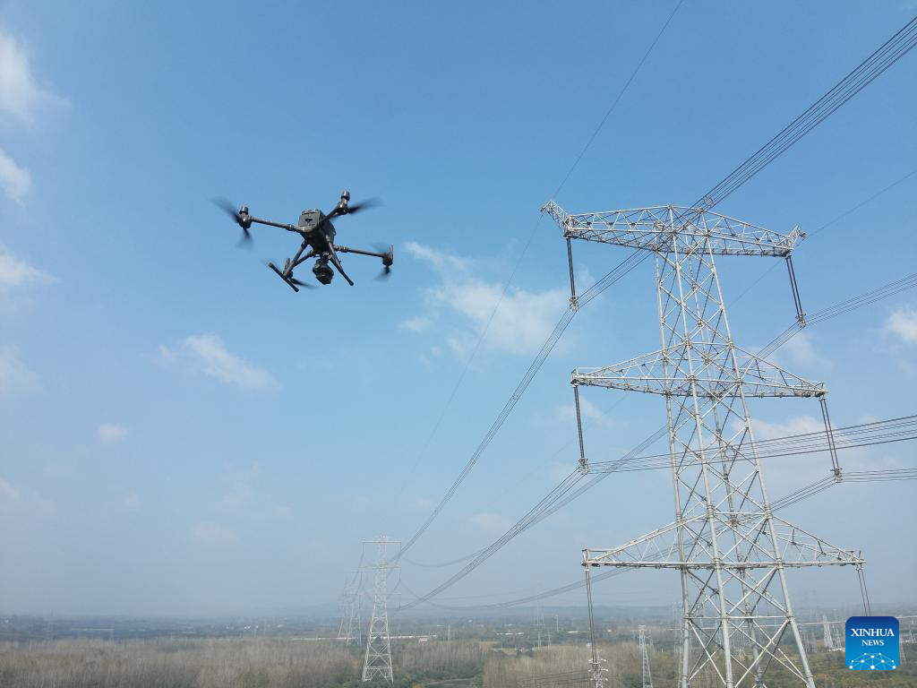 This file photo taken in August 2025 shows a drone collecting data from an ultra-high voltage direct current (UHVDC) transmission line in Xuancheng, east China's Anhui Province. (Xinhua)