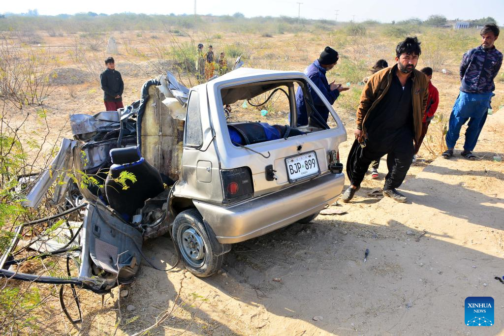Locals gather near a damaged car at the accident site in Jamshoro district in Sindh province, Pakistan, on Jan. 24, 2026. A collision between a car and a truck left at least nine people killed and several others injured in Pakistan's southern Sindh province, police said on Saturday. (Str/Xinhua)