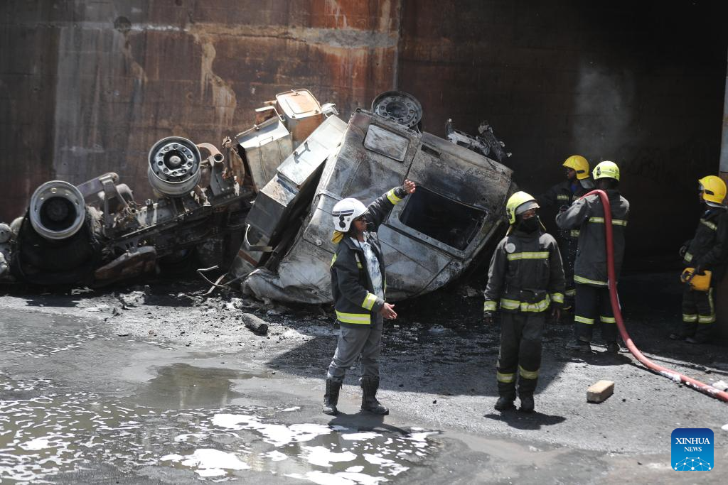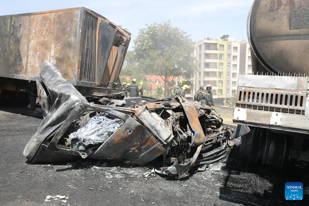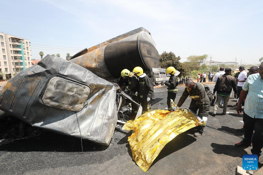 Emergency workers work at the site of an oil tanker explosion in Nairobi, the capital of Kenya, Jan. 24, 2026. At least one person killed after an oil tanker collided with a truck and exploded on a road near Wilson Airport in Nairobi, Kenya, local media reported. (Photo by Henry Naminde/Xinhua)