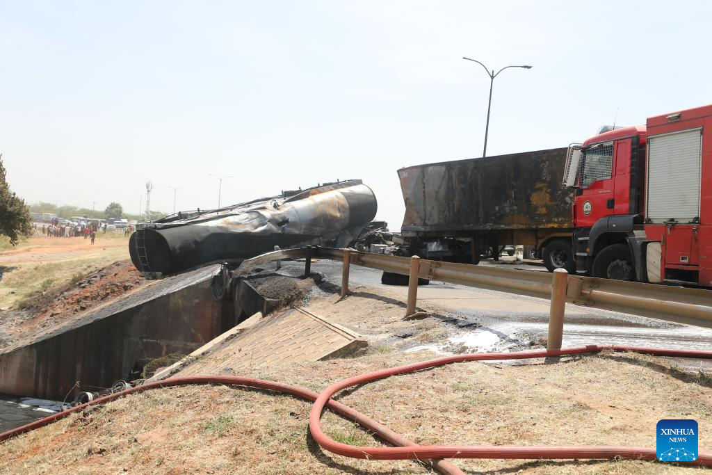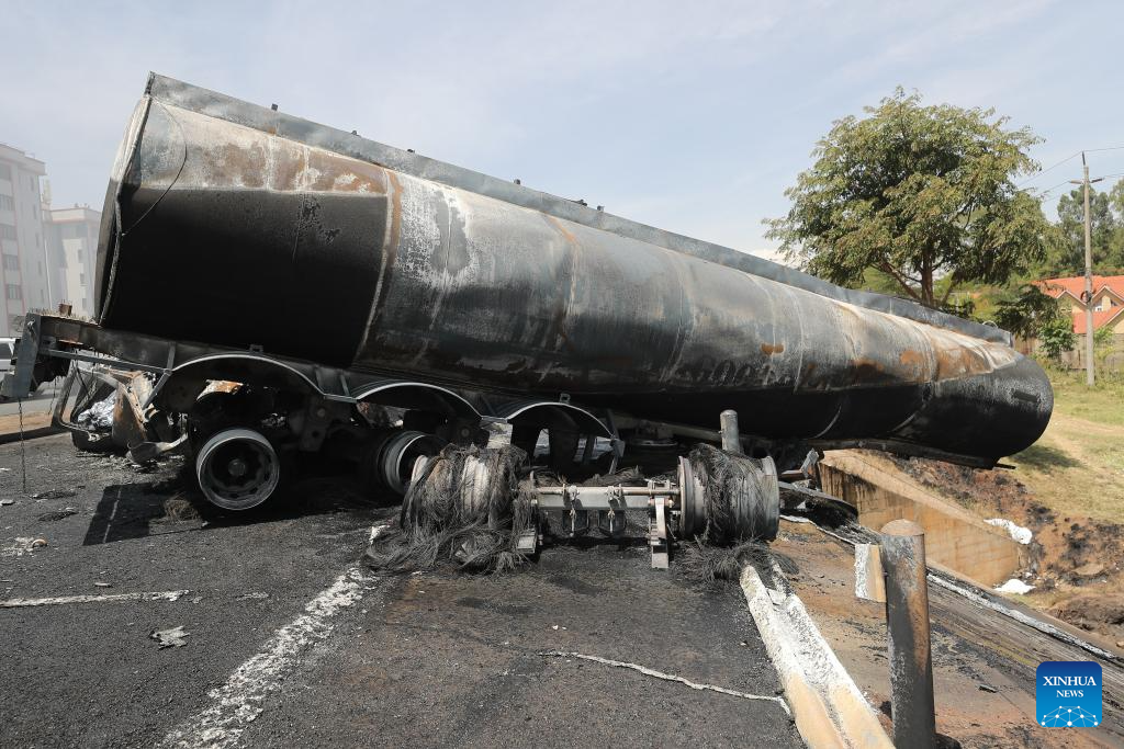 This photo taken on Jan. 24, 2026 shows the site of an oil tanker explosion in Nairobi, the capital of Kenya. At least one person killed after an oil tanker collided with a truck and exploded on a road near Wilson Airport in Nairobi, Kenya, local media reported. (Photo by Henry Naminde/Xinhua)