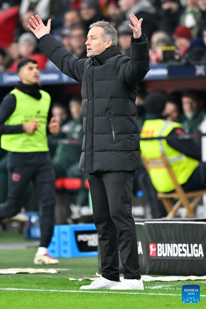 Werder Bremen's head coach Horst Steffen gestures during the German first division Bundesliga football match between Bayer 04 Leverkusen and SV Werder Bremen in Leverkusen, Germany, Jan. 24, 2026. (Photo by Ulrich Hufnagel/Xinhua)