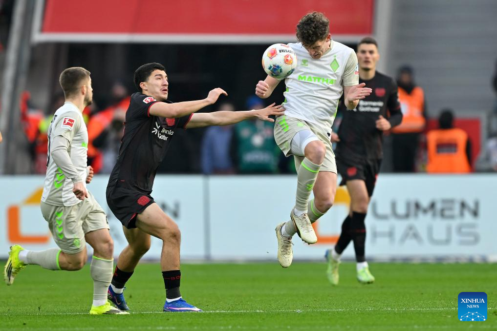 Ibrahim Maza (C) of Bayer 04 Leverkusen vies with Jens Stage (R) of SV Werder Bremen during the German first division Bundesliga football match between Bayer 04 Leverkusen and SV Werder Bremen in Leverkusen, Germany, Jan. 24, 2026. (Photo by Ulrich Hufnagel/Xinhua)