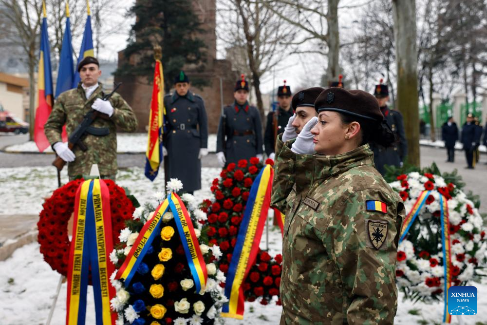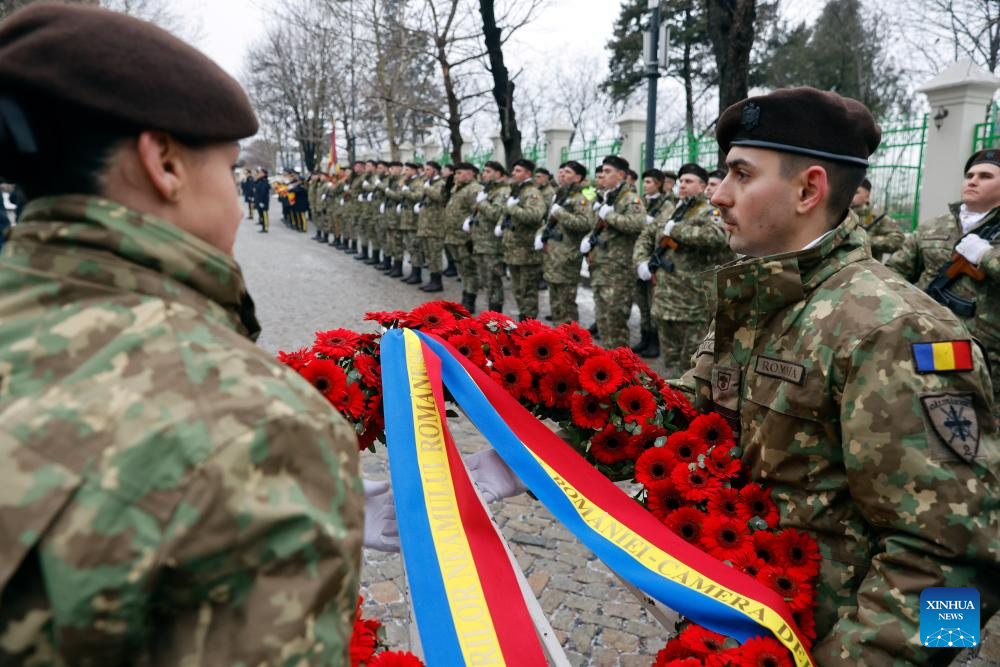 Romanian soldiers carry a wreath during a ceremony marking the Day of the Union of the Romanian Principalities in Bucharest, Romania, on Jan. 24, 2026. (Photo by Cristian Cristel/Xinhua)
