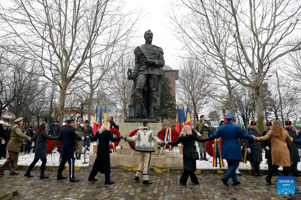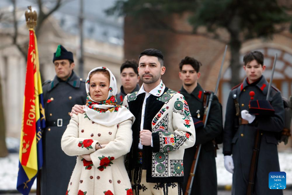 Romanians dressed in traditional costumes attend a ceremony marking the Day of the Union of the Romanian Principalities in Bucharest, Romania, on Jan. 24, 2026. (Photo by Cristian Cristel/Xinhua)